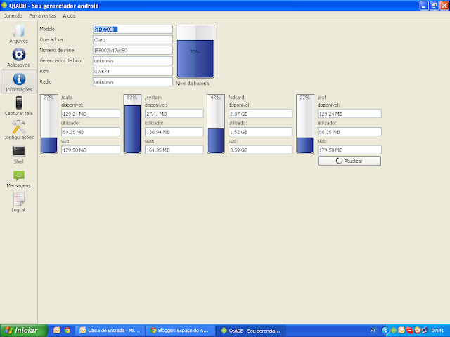 Aqui você tem todas as informações mesmo de seu dispositivo, diz qual modelo, bateria, memória livre e usada e muitas outras informações interessantes para você.